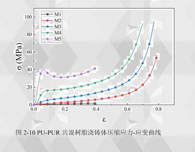 PU-PUR共混樹脂澆鑄體的壓縮應力-應變曲線如圖2-10所示,可以看出,M4M5聚脲樹脂澆鑄體在應力-應變曲線上出現了明顯的線彈性階段和屈服階段。在應變達到0.39的時候M1聚氨酯和M5聚脲樹脂澆鑄體都已經處于變形失效的狀態,聚氨酯澆鑄體發生扭曲變形失效,聚脲澆鑄體發生脆性斷裂失效。而共混樹脂澆鑄體M2、M3M4在應變達到0.5以上時才開始逐漸失效且擁有更長的平臺段,失效應變分別為0.640.590.51。說明在應變率較大的情況下,M2、M3M4樹脂澆鑄體的壓縮力學性能 要強于單獨的M1聚氨酯和M5聚脲,可以承擔更大的壓縮位移而不失效。