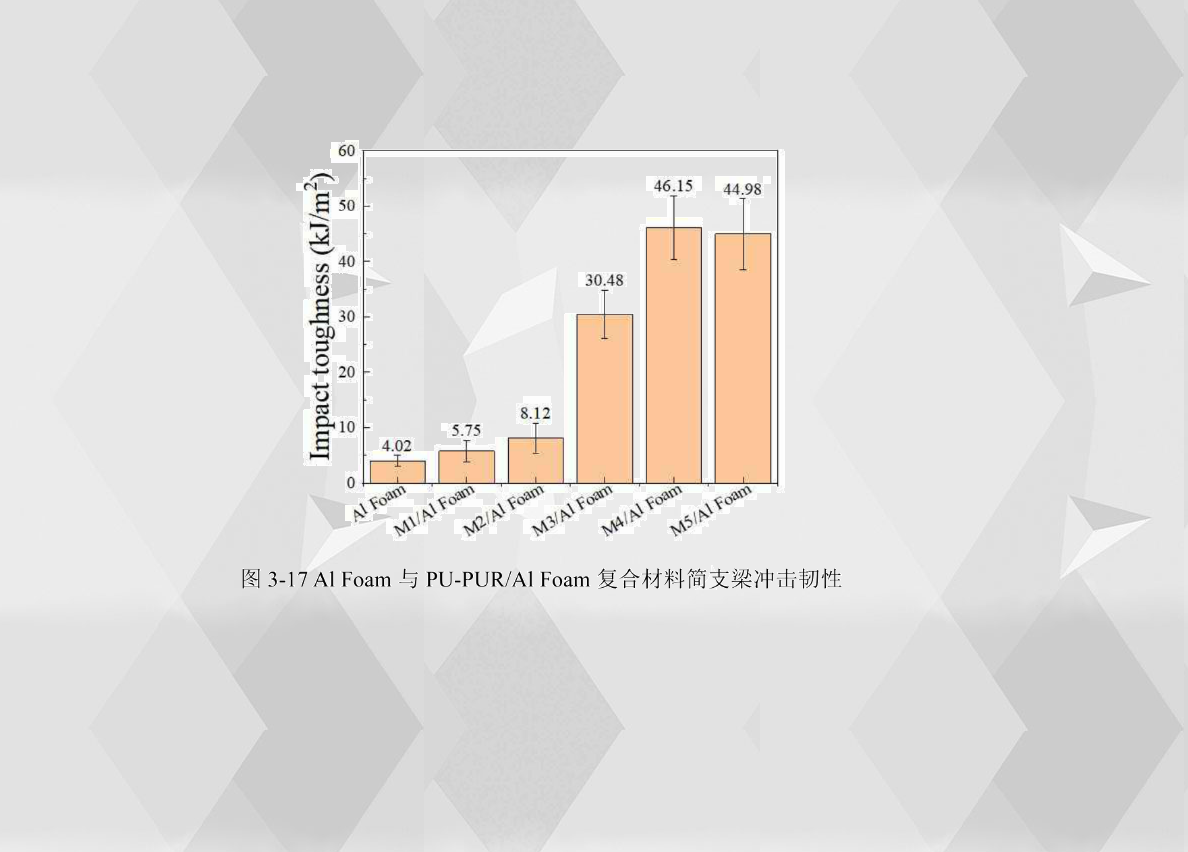從圖3-17中可以看到,Al Foam的沖擊韌性為4.02 kJ/m2, 而M1/Al Foam的沖擊韌性為5.75kJ/m2, 比Al Foam增加了43.03%。M2/Al Foam的沖擊韌性為8.12 kJ/m2, 比M1/Al Foam增加了41.21%。M3/Al Foam的沖擊韌性為30.48kJ/m2,比M2/Al Foam增加了275.36%。M4/Al Foam的沖擊韌性為46.15kJ/m2,比M3/Al Foam增加了51.41%。 M5/Al Foam的沖擊韌性為44.98kJ/m2,比M4/Al Foam減少了2.52%。從沖擊韌性來(lái)看M3/Al Foam、M4/Al Foam和M5/Al Foam的沖擊韌性相對(duì)于Al Foam、M1/Al Foam、 M2/Al Foam和M3/Al Foam明顯更高。說(shuō)明填充高聚脲成分共混樹(shù)脂到Al Foam中能極大加強(qiáng)其沖擊韌性,M4/Al Foam和M5/Al Foam的沖擊韌性數(shù)值很接近,說(shuō)明M4/Al Foam和M5/Al Foam在抵抗簡(jiǎn)支梁沖擊荷載時(shí)的能力相近。