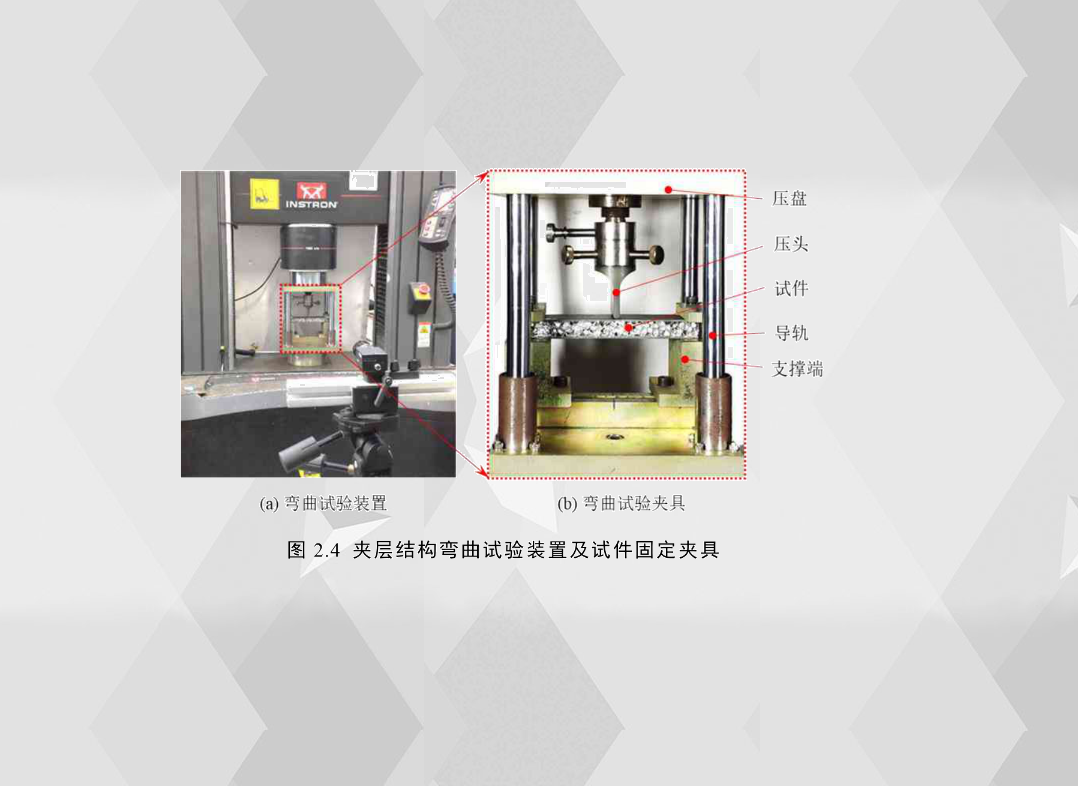 本章所有夾層結構的三點彎曲實驗均在通用試驗機上進行,2.4(a)所示。考慮到夾層結構在汽車結構件中很少以簡支梁的形式存在,比如汽車前后保險杠、B柱等,所以在實驗研究中固定試件對實際研究更有指導意義,此外為了保證壓頭在加載過程中與試件的水平方向保持垂直,設計了與壓盤剛性連接導軌,試件加載初始狀態如圖2.4(b)所示,該裝置主要由壓盤、壓頭、導軌、支撐端組成,試件通過兩個固定塊和四個螺栓固定在支撐端上,固定每個試件的螺栓的預緊力是相同的,并且保證夾緊端泡沫鋁沒有塑性變形。壓頭的沖擊端為半圓柱形,半徑為2.5mm;與試件靠中間接觸的兩支撐端拐角處各有一個半徑為2.5mm1/4圓弧,兩個1/4圓弧與試件接觸點之間的距離就是跨度為120mm。為了研究彎曲過程的變形機理及失效模式,實驗中用相機采集試件的變形和屈曲過程,為了使相機能清晰地采集圖片,試驗之前采用兩塊面光源對試件進行補光。所有夾層結構彎曲試驗的加載速度為2mm/min,在觸發相機采集的同時,觸發實驗加載裝置,使電腦采集到的載荷-位移曲線與圖像能一一對應。