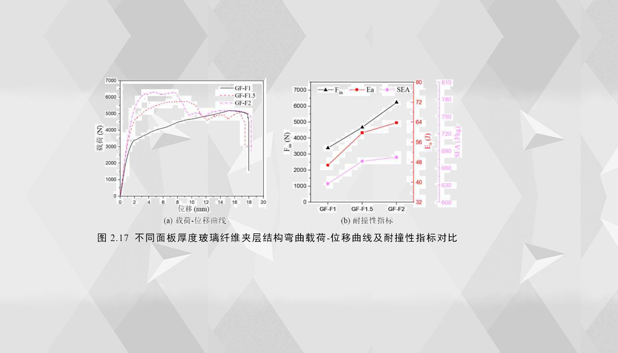 2.4.1面板對結(jié)構(gòu)耐撞性能影響——E圖2.17(a)比較了不同面板厚度玻璃纖維夾層結(jié)構(gòu)的載荷-位移曲線,可以看出,三者都屬于曲線類型Ⅲ,GF-F1與GF-F1.5的臨界失效模式為壓痕壓入(IN),其發(fā)生臨界失效之后載荷并沒有下降,只是增加幅度減少,這和CF-F1類似。GF-F1從加載開始到試件整體完全失去承載能力,未出現(xiàn)明顯的較為緩慢的載荷下降。與GF-F1不同的是,GF-F1.5在彎曲位移9mm左右時,還出現(xiàn)芯層剪切裂紋以及后續(xù)的界面失效,載荷下降較多。GF-F2的臨界失效模式出現(xiàn)芯層剪切(CS)和壓痕壓入(IN)兩者的組合,在出現(xiàn)失效后的小段位移內(nèi),載荷沒有明顯下降趨勢,而是基本保持相對恒定;當(dāng)加載位移繼續(xù)增加,出現(xiàn)明顯的芯層裂紋以及后續(xù)的界面失效,載荷顯著降低,這與GF-F1.5的后屈曲失效機理相似。