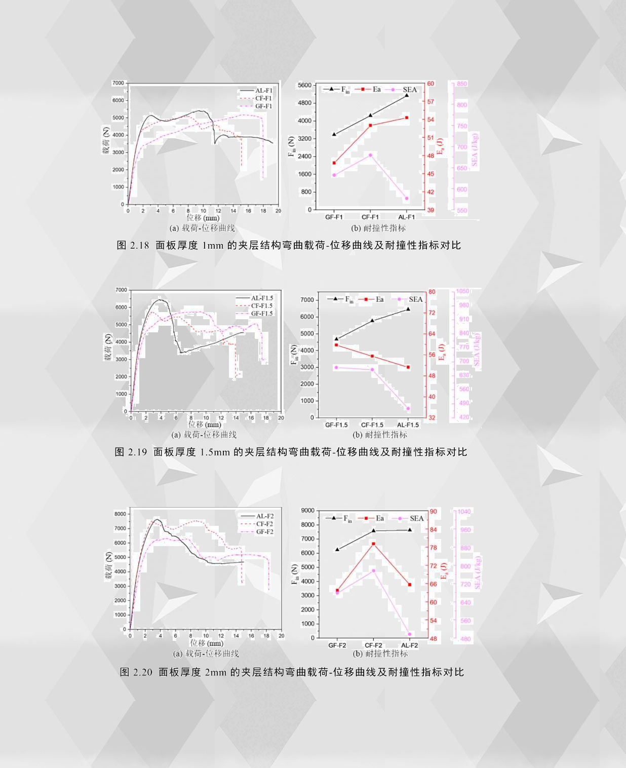 2.4.1面板對結構耐撞性能影響——F為了研究面板材料在彎曲工況下對夾層結構力學性能的影響,比較了同一厚度下不同面板材料的夾層結構的載荷-位移曲線,如圖2.18(a)所示,結合壓潰失效過程分析,對面板為1mm的試件而言,試件GF-F1、CF-F1和AL-F1的臨界失效模式均為壓痕壓入(IN),但纖維增強夾層結構與鋁合金夾層結構不同的是,由于纖維復合材料不像鋁合金那樣有明顯的塑性變形,試件達到臨界失效時,前者的面板發(fā)生了彈性變形,后者發(fā)生塑性變形,前者載荷達到臨界載荷時會繼續(xù)增大,只是增加幅度有所減小,而后者載荷會減小。試件GF-F1在斷裂之前,未出現(xiàn)明顯的芯層剪切裂紋且未出現(xiàn)載荷下降;CF-F1后屈曲過程出現(xiàn)芯層剪切裂紋(彎曲位移約8mm處),而AL-F1后屈曲過程中出現(xiàn)界面失效和剪切裂紋(彎曲位移約10mm處),從載荷-位移曲線中可以看出在這兩處失效時,后者的載荷下降速度更快。