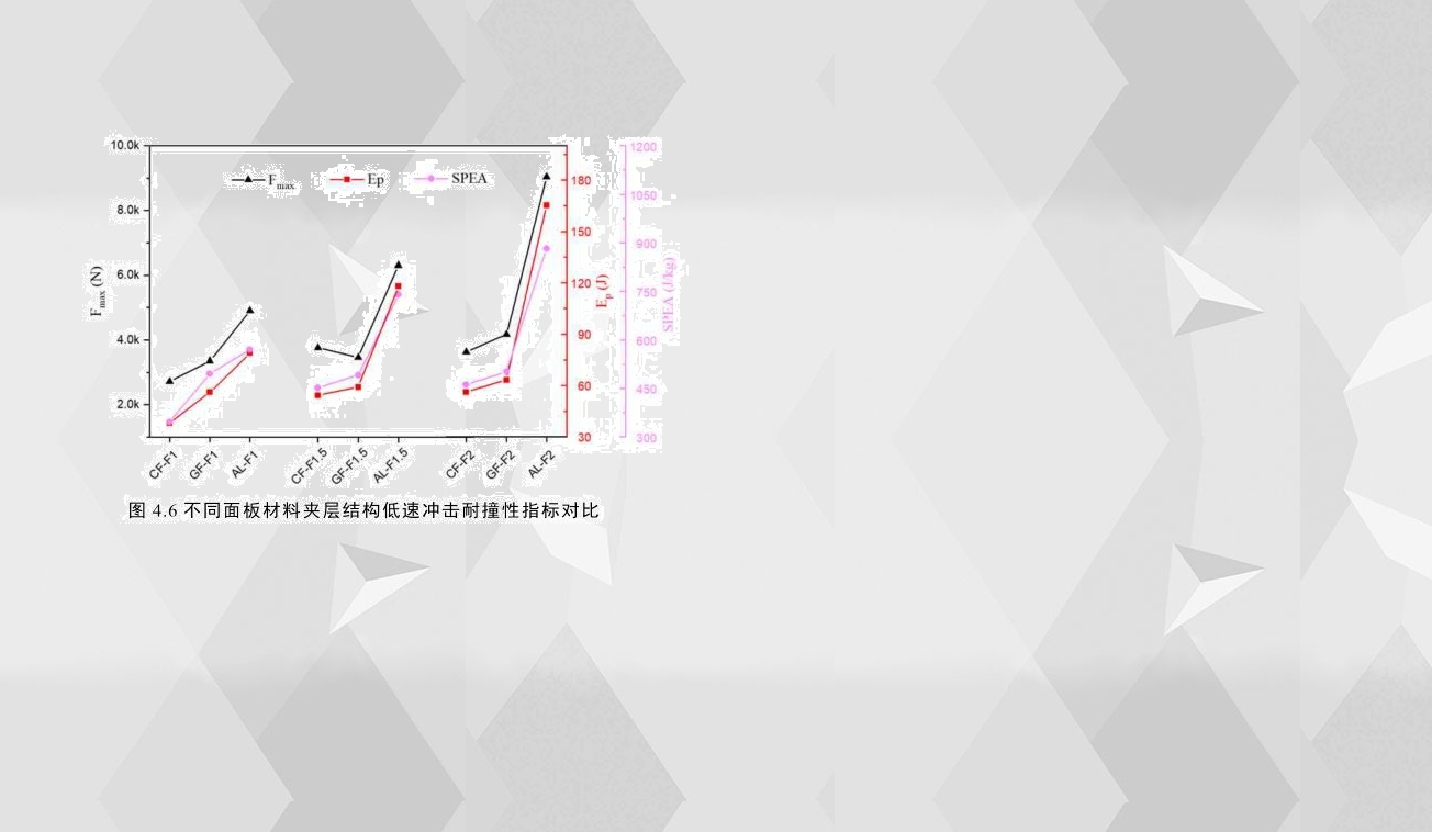為了更為直觀地比較不同面板材料的夾層結構的抗沖擊性能,4.6比較了相同面板厚度但面板材料不同的夾層結構的耐撞性指標,通過比較可以看出,鋁合金夾層結構有最優的耐撞性能,其臨界穿透能高達118J初始峰值載荷高達6297N而碳纖維增強夾層結構的耐沖擊性能明顯低于鋁合金夾層結構的,其臨界穿透能和初始峰值載荷分別為54J和3752N而與碳纖維增強夾層結構相比,玻璃纖維的耐碰撞性略有提高,其臨界穿透能為59J。此外,根據三者完全穿透試件的載荷-位移在第一階段的斜率可以看出,如圖4.5(d)鋁合金夾層結構的斜率最大,也就是說,在低速沖擊工況下,鋁合金夾層結構的剛度大于纖維增強夾層結構的剛度。通過觀察面板厚度為1mm和2mm試件的耐撞性指標,也可以知道,在低速沖擊工況下,鋁合金夾層結構有最好的耐撞性能,而碳纖維夾層結構的耐撞性能在三者幾乎是最差的。