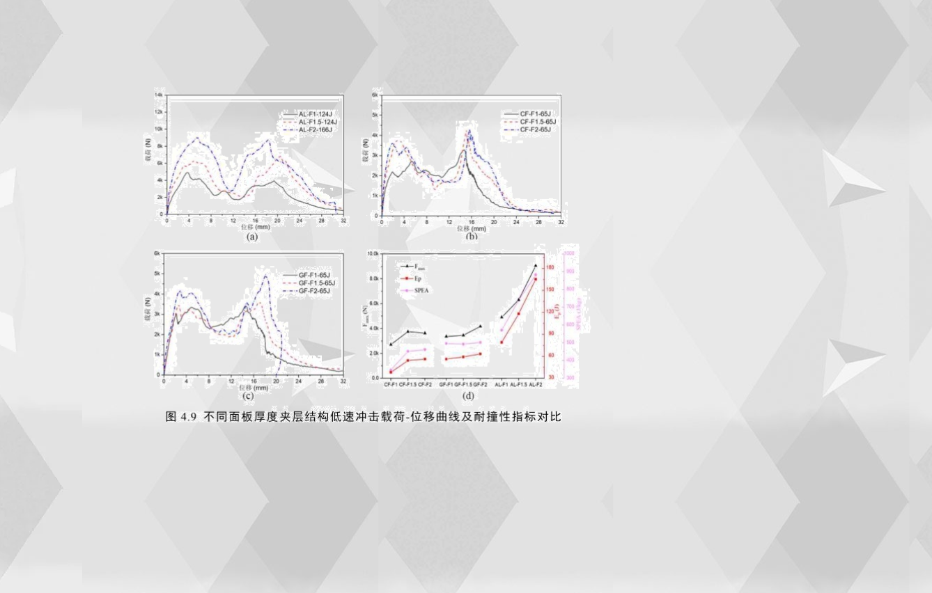 為了研究夾層結構的面板厚度對沖擊性能的影響,圖4.9(a)-(c)比較了三種不同面板厚度的夾層結構的載荷-位移曲線。無論是彈塑性面板還是脆性面板,夾層結構的面板厚度對其低速沖擊響應均有較大影響。為了更直觀地比較,圖4.9(d)對比了不同面板厚度夾層結構的耐撞性指標,通過觀察,鋁合金夾層結構的耐撞性能隨面板厚度增加而明顯增加,面板厚度從1mm增加到2mm其初始峰值載荷、穿透吸能和比穿透吸能分別提高了84%、108%和54%;對玻璃纖維夾層結構而言,當面板厚度從1mm增加到2mm,其初始峰值載荷和穿透吸能分別只提高了24%和13%,而面板厚度的增加對比穿透吸能的影響效果差異不大;而對碳纖維夾層結構而言,當面板厚度從1mm增加到2mm,其穿透吸能和比穿透能分別提高了42%和33%,并且隨著層數的增加,耐撞性指標增加的幅度大幅減小。