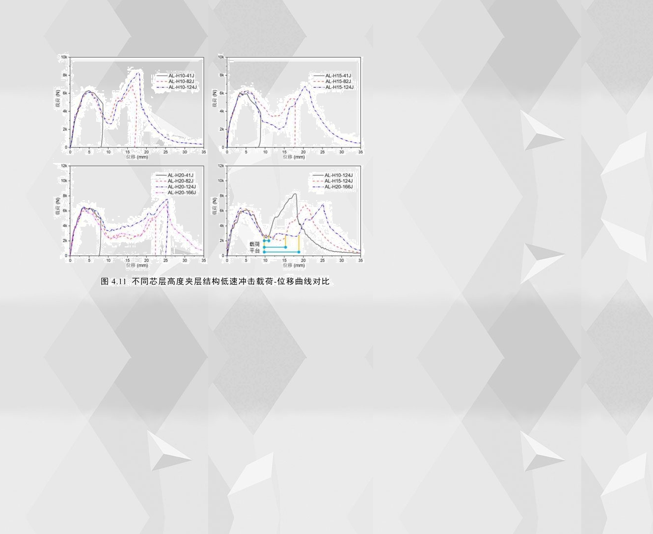 圖4.11為相同配置的夾層結(jié)構(gòu)在不同沖擊能量下及不同芯層高度的試件在穿透能下的載荷-位移曲線,通過(guò)對(duì)比可以看出,芯層高度為10mm、15mm和20mm的試件的載荷-位移曲線基本相似,曲線均具有兩個(gè)波峰且波谷處載荷大小相差不大;不同的是,隨著試件芯層高度的增加,波谷附近的載荷平臺(tái)的長(zhǎng)度逐漸變長(zhǎng)。